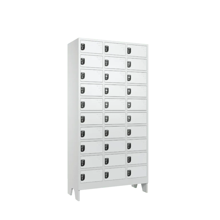 Armário de plástico colmeia para vestiário com 30 portas para uniformes de funcionários, usado para a troca e reposição diária de uniformes. Possui traseira aberta para abastecimento feito pela lavanderia. Acesso livre para a lavanderia facilitando a rotina diária. Indicado para uso em frigoríficos, industria alimentícia, industria farmacêutica, e fábricas de diversos segmentos que possuam sua própria lavanderia integrada a sua operação.