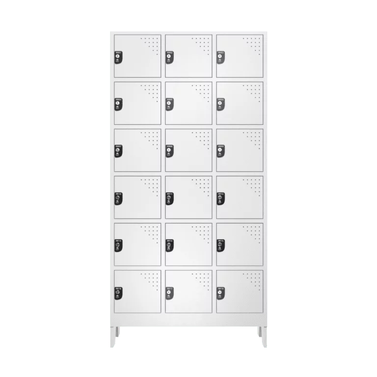 Com pés elevados integrados, o Armário Multiuso de 18 Portas é fácil de limpar e mover, facilitando a manutenção diária.