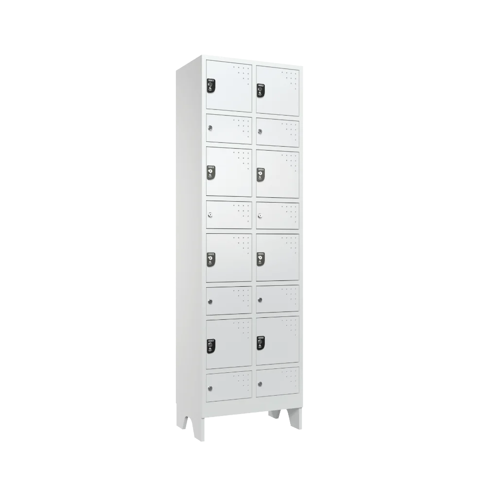 O Armário para vestiário civil roupeiro 8 usuários é ideal para armazenamento, proteção e segurança de objetos e pertences de funcionários e seus EPI’s. Muito utilizado em frigorífico, hospital, lavanderia e indústria de alimentos. Atende NR24.